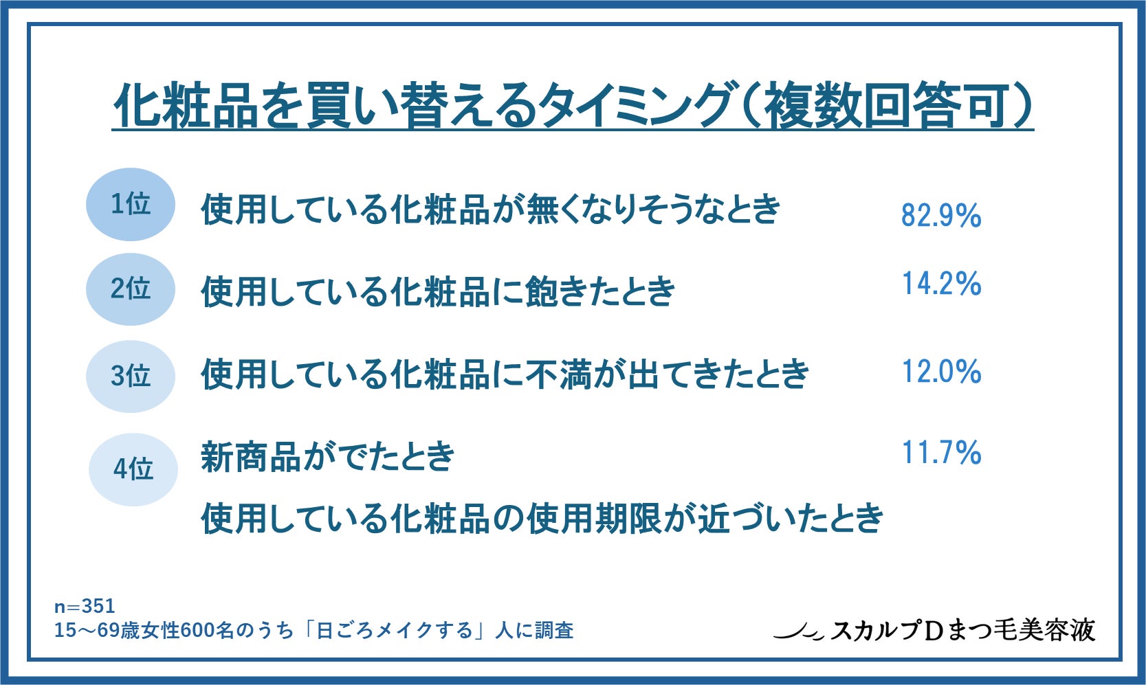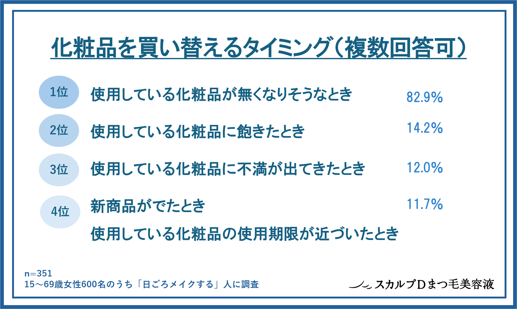 化粧品を買い替えるタイミング1位は「使用している化粧品が無くなりそうなとき」。