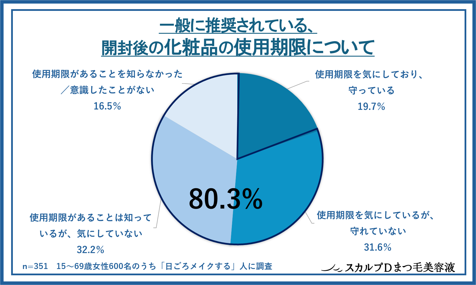 「使用期限を気にしており、守っている」と回答した人はわずか19.7%でした。「使用期限を気にしているが、守れていない」「使用期限があることは知っているが、気にしていない」「使用期限があることを知らなかった/意識したことがない」という意見が合計80.3%であり、8割が化粧品の使用期限を守っていない、気にしていないことが明らかになりました。